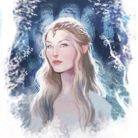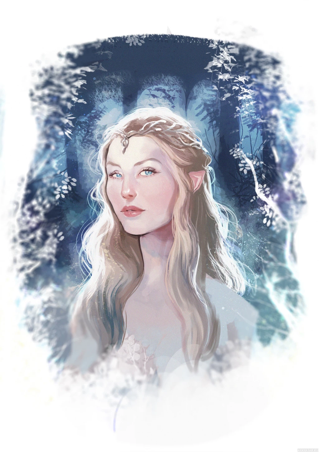 The image depicts a character that resembles Galadriel from the "Lord of the Rings" franchise. She is shown with long