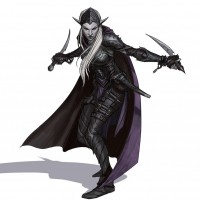 a dark armor with a cloak and is wielding a pair of swords. This kind of character is often associated with the D&D (Dungeons & Dragons) fantasy role-playing game, where elves are known for their agility, keen senses, and