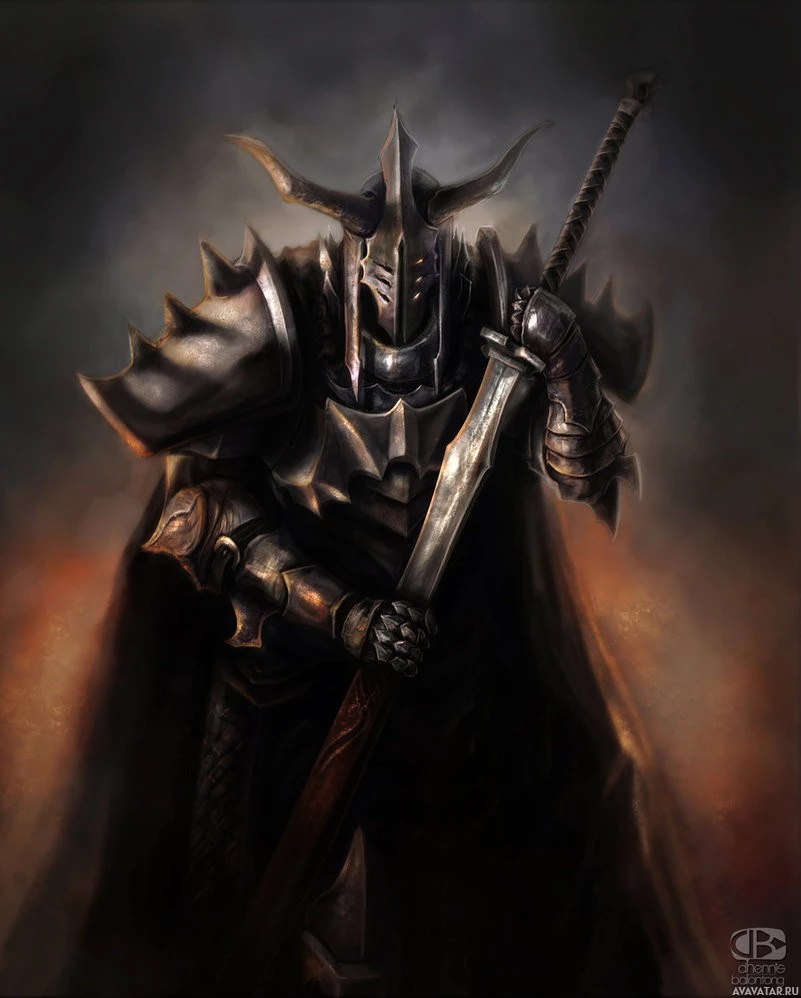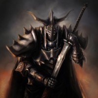 pointed ears, and a sword held in the right hand. The background has a dark,