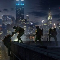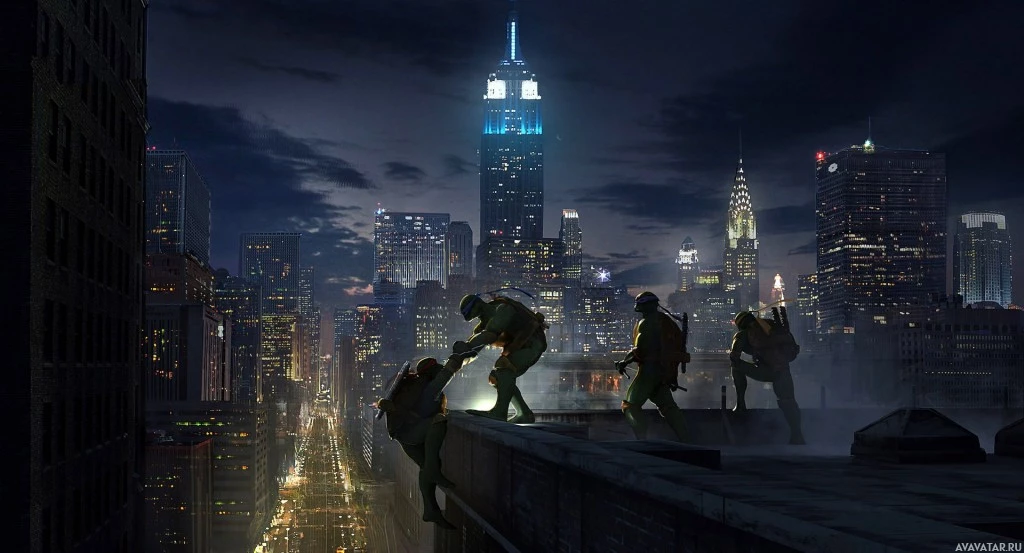 an urban setting, possibly inspired by New York City due to the silhouette of the Empire State Building in the background. There are multiple figures visible, some of which seem to be holding weapons or tools that resemble those used by the Teenage Mutant