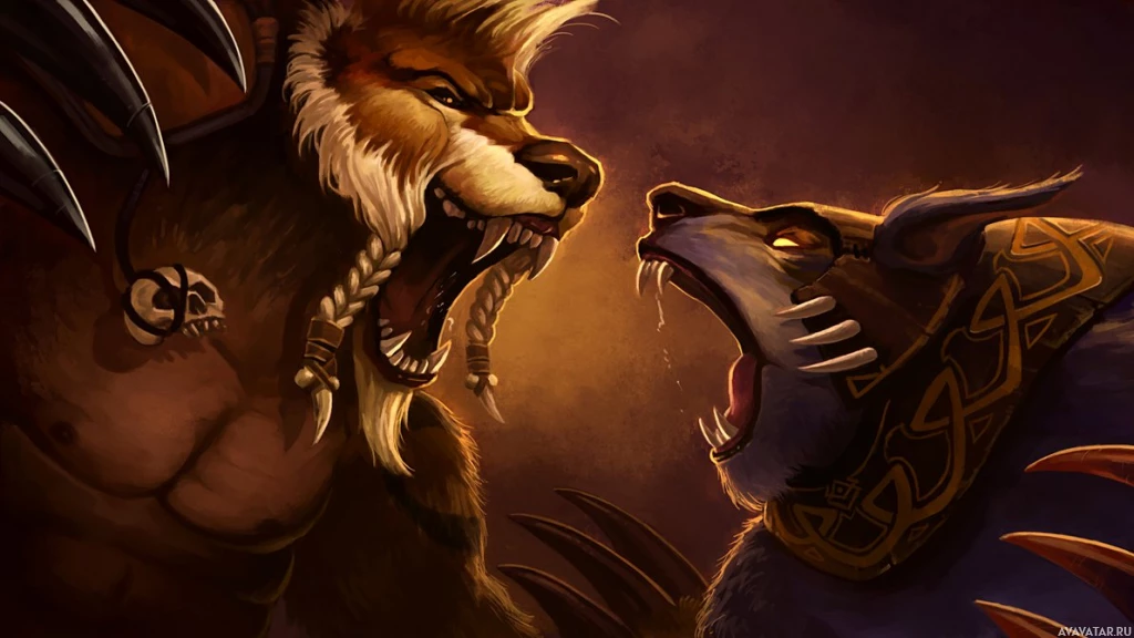 a fierce expression as if he's growling or snarling at his opponent. Lone Druid, on the other hand, appears more serene and focused. Both characters are stylized in their