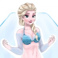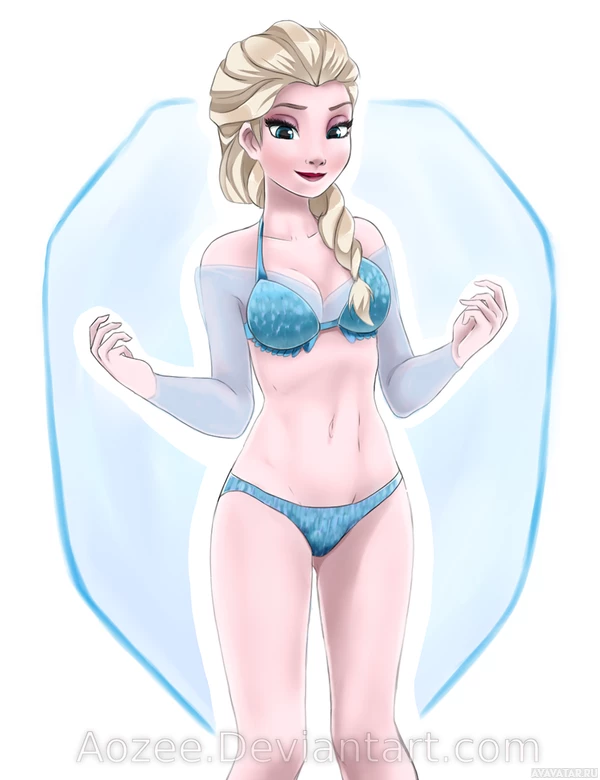 The image depicts a character designed to look like Elsa, the princess from the animated film "Frozen." In this stylized version, she is shown wearing a bikini and has her arms raised in front of her. The background suggests ice or water, with