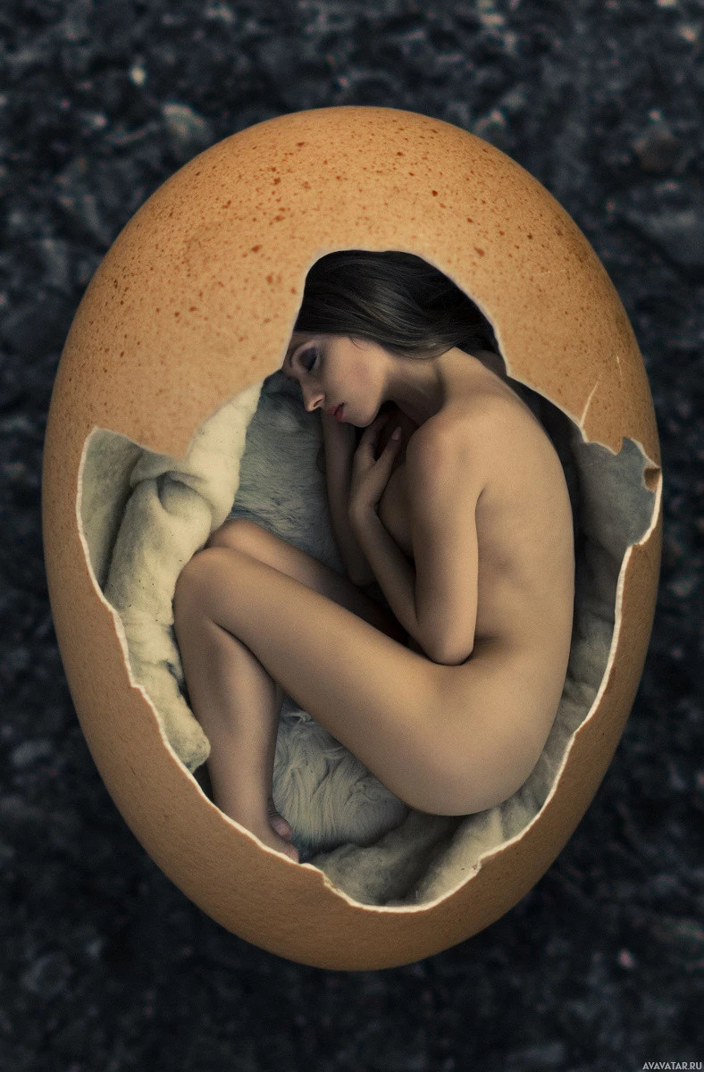 an open eggshell. It is a surreal and artistic representation, as eggs do not naturally contain people inside them. There is no text visible in the image, and the focus is on the juxtaposition of