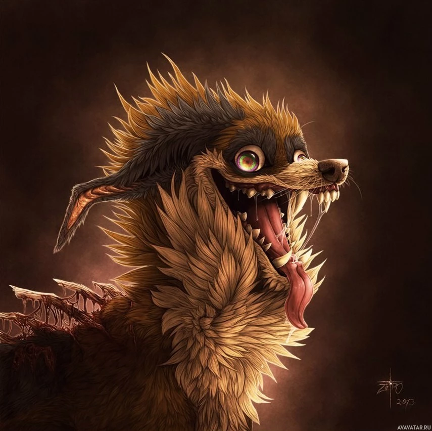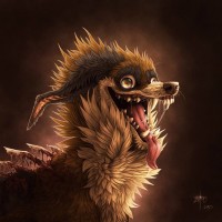 sharp teeth, its eyes are wide open in surprise or excitement, and it appears to be making a yelping or howling sound. The background is dark and moody, providing contrast to the creature's