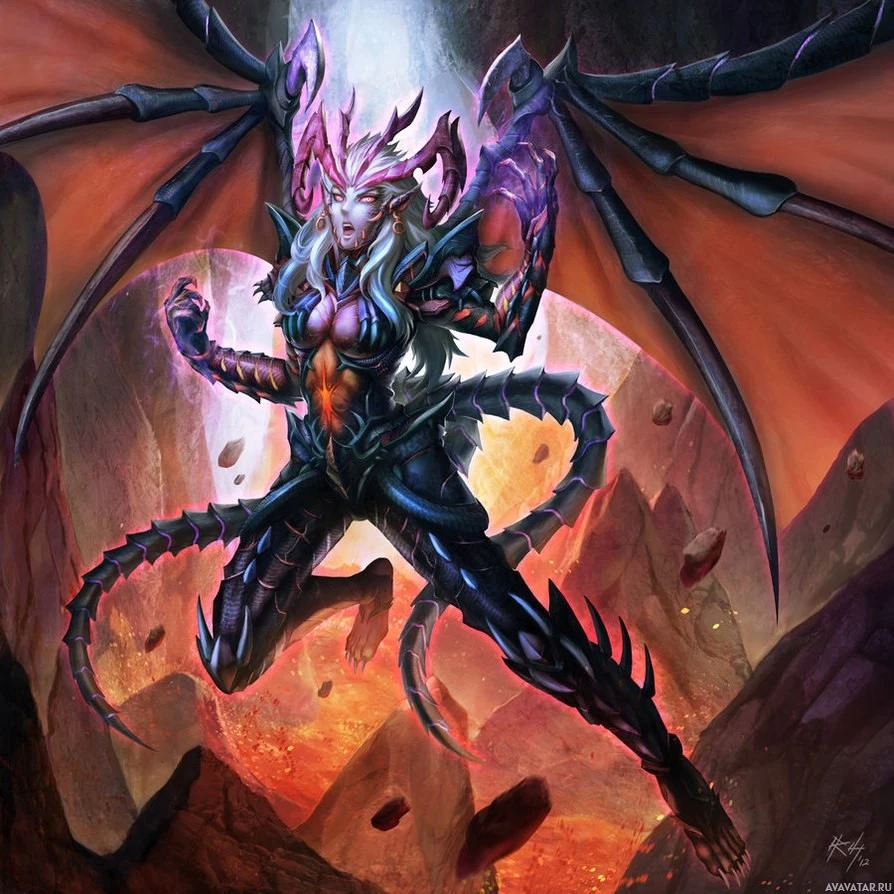 a fantasy character, commonly known as a succubus or demoness. She is shown with red and purple tones, often associated with magma or hellfire. She has horns, wings, and an infernal appearance. This creature is part of folklore and mythology and is often portrayed as seductive in nature. The setting appears to be a volcanic or infernal landscape.