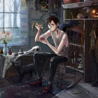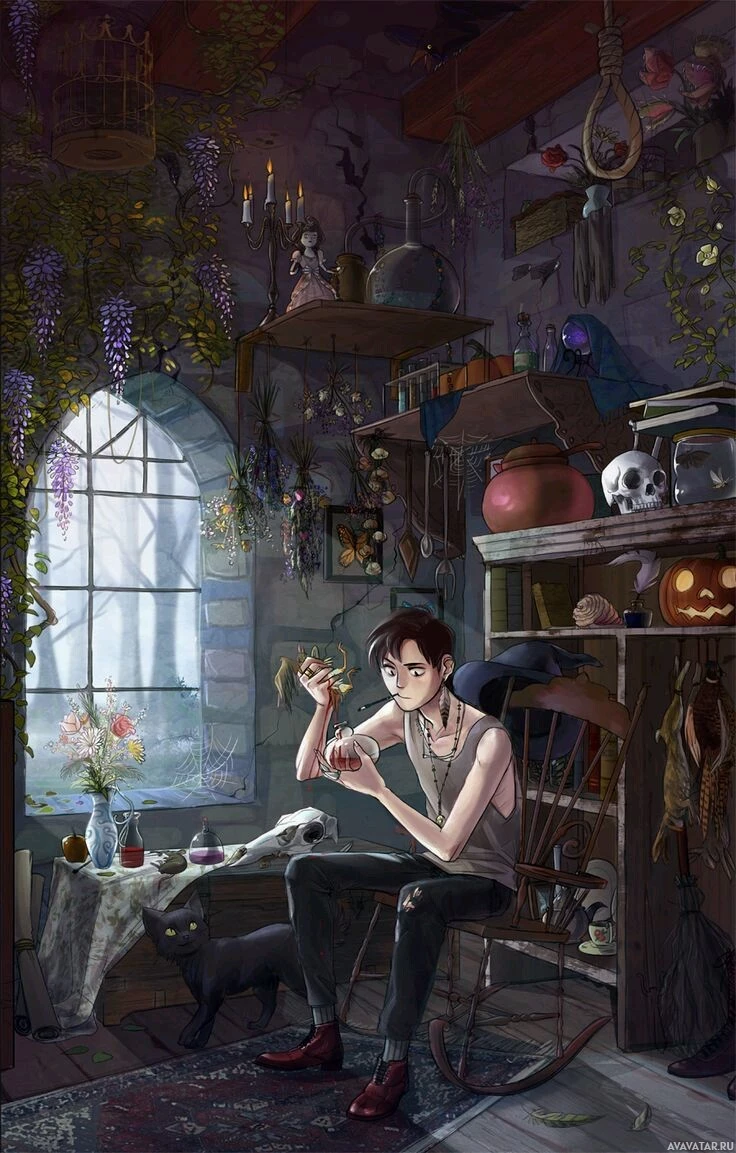 natural light in, suggesting it might be evening or nighttime. There's no indication of the character being male or female due to the artistic representation, which focuses on the overall ambiance and content rather than explicit details about the character.