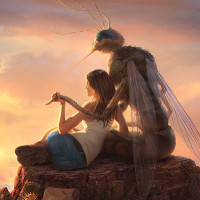 an adult character, possibly a guardian or mentor figure, also seated but facing away from the camera, with what seems to be a long-nosed mask or face covering their identity. The