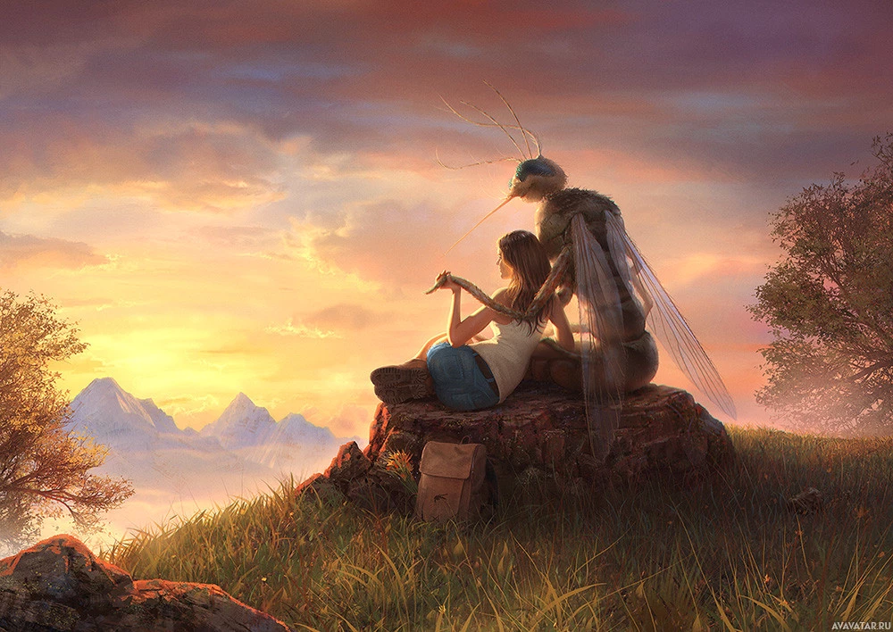 setting sun and the warm glow suggest it's either dawn or dusk. There are no mosquitoes or insects visible in this picture, and there is no fun element depicted; rather, the image has a serene and contemplative atmosphere.