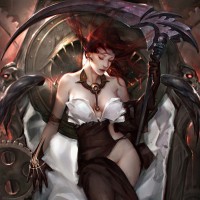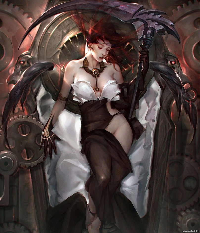 a female character with red hair, sitting on a throne that appears to be constructed from mechanical parts. She is holding an ornate staff, which may suggest she holds some