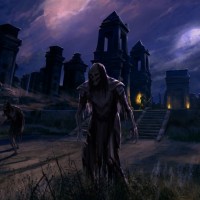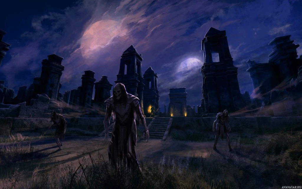 nighttime setting that looks like it could be an old graveyard or abandoned ruins. There is