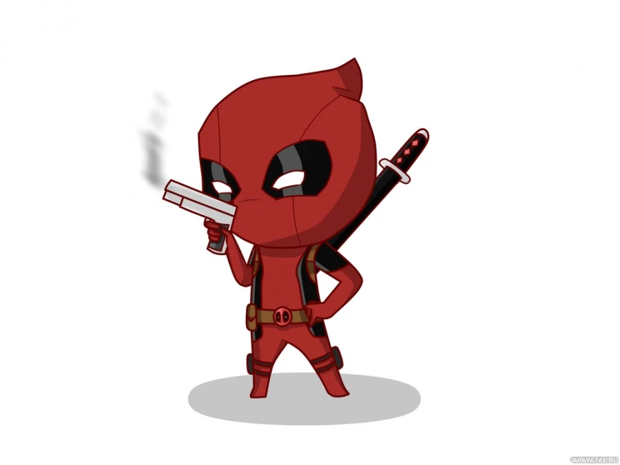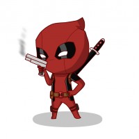 The image features an illustration of the character Deadpool, known for his red and black costume and distinctive appearance. In this particular depiction, Deadpool is holding a cigarette in one hand while gesturing with the other, as if he's giving directions or making a point. He's standing against