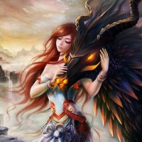 a fantasy scene featuring a young red-haired girl. She is reaching out towards a dragon with a large, fierce appearance. Both characters are set against a backdrop that suggests a mystical or otherworldly setting, possibly