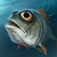 The image shows a stylized or digitally altered depiction of a fish. The fish has a prominent eye and is surrounded by what appear to be