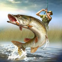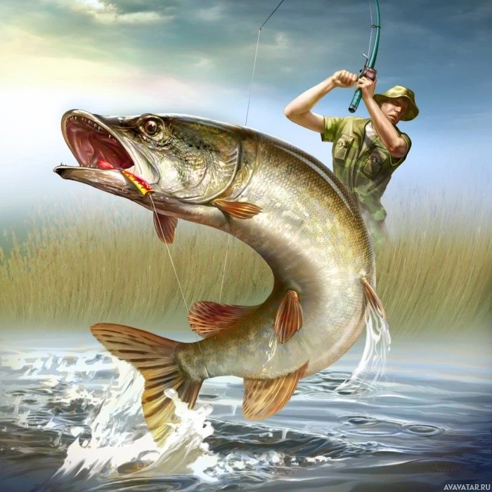 large fish, commonly known as a pike or pickerel, is prominently featured in the foreground. It appears to be jumping out of the water towards the man, possibly as part of its