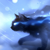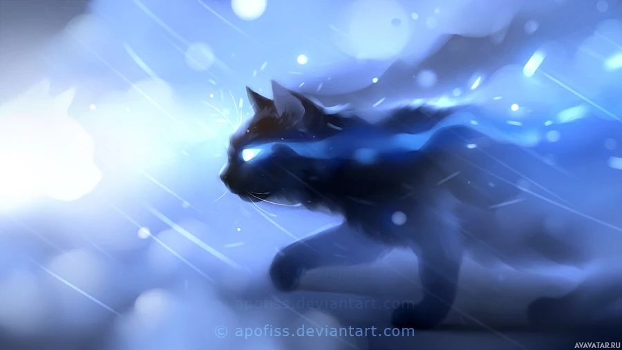 a stormy sky with clouds and rain. The cat's fur is rendered with intricate details that suggest it may have a thick,