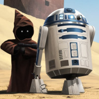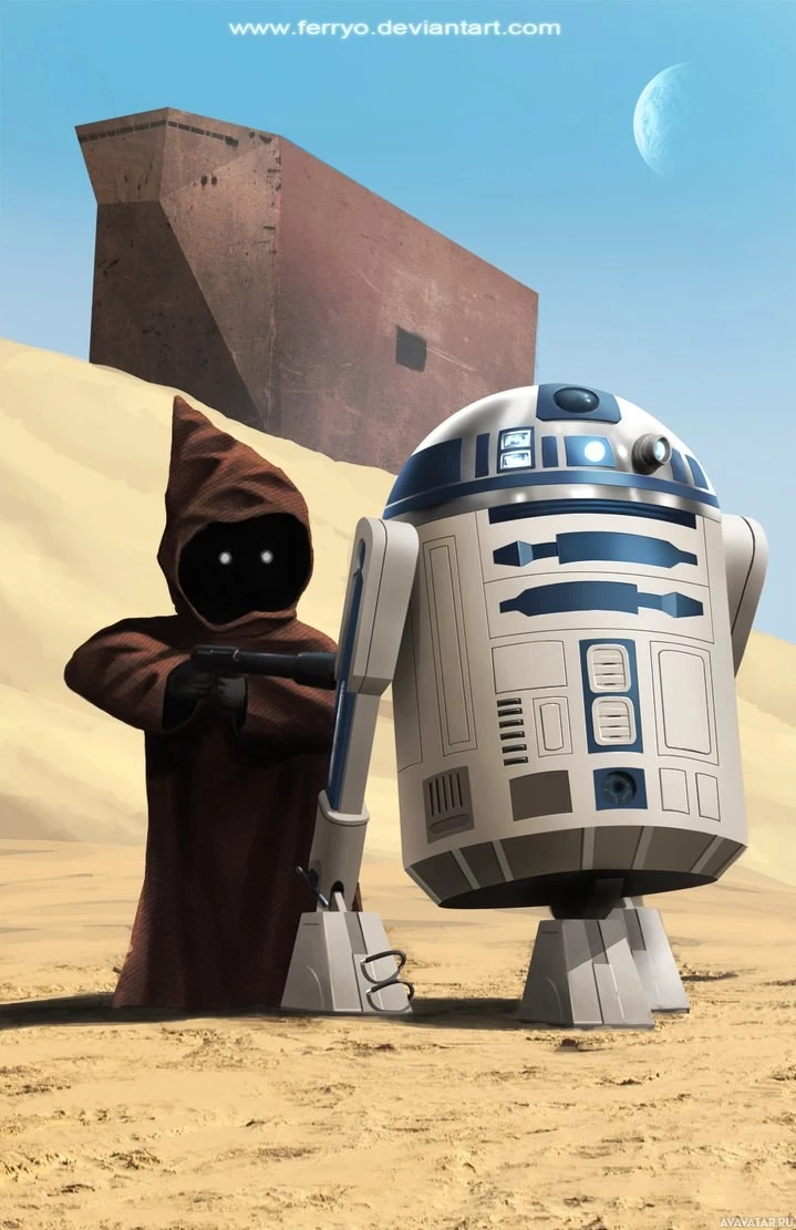 a desert setting, possibly Tatooine, which is known for its sandy landscapes and was featured prominently in the original Star Wars movie series. The characters are depicted with their distinct features: C-3PO with his golden appearance and humanoid body, and