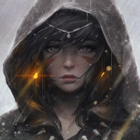 a cold setting like a mountain or a fortress. There is also an arrow visible on the right side of the image, which might be part of the character's attire or symbolism related to their role within the story.