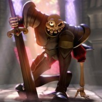medieval armor, holding a sword with both hands. The character appears to be an animated or stylized depiction of a knight or warrior from