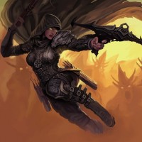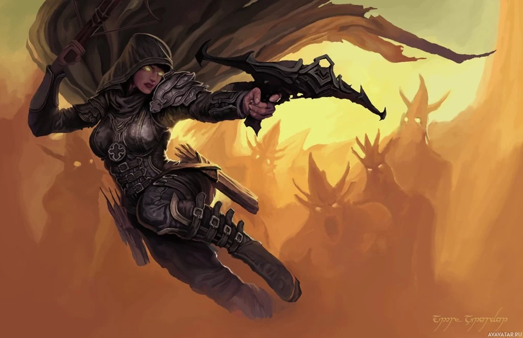 a fantasy character, specifically labeled as a "Demon Hunter" from the Diablo series of video games. This character is dressed in armor and wielding a bow, capturing