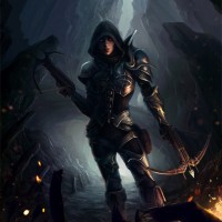 a hooded cloak, giving them an ominous appearance. They are holding a bow in their right hand and a sword in their left hand. The setting appears to be within a dungeon or cave-like environment with