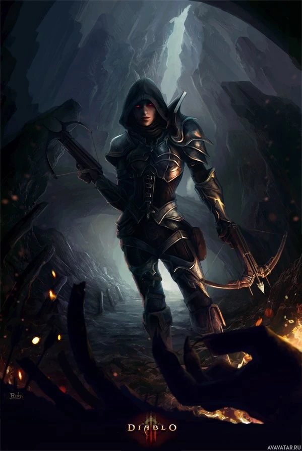 a Demon Hunter, which is one of the classes available in the game. The character is wearing dark armor and
