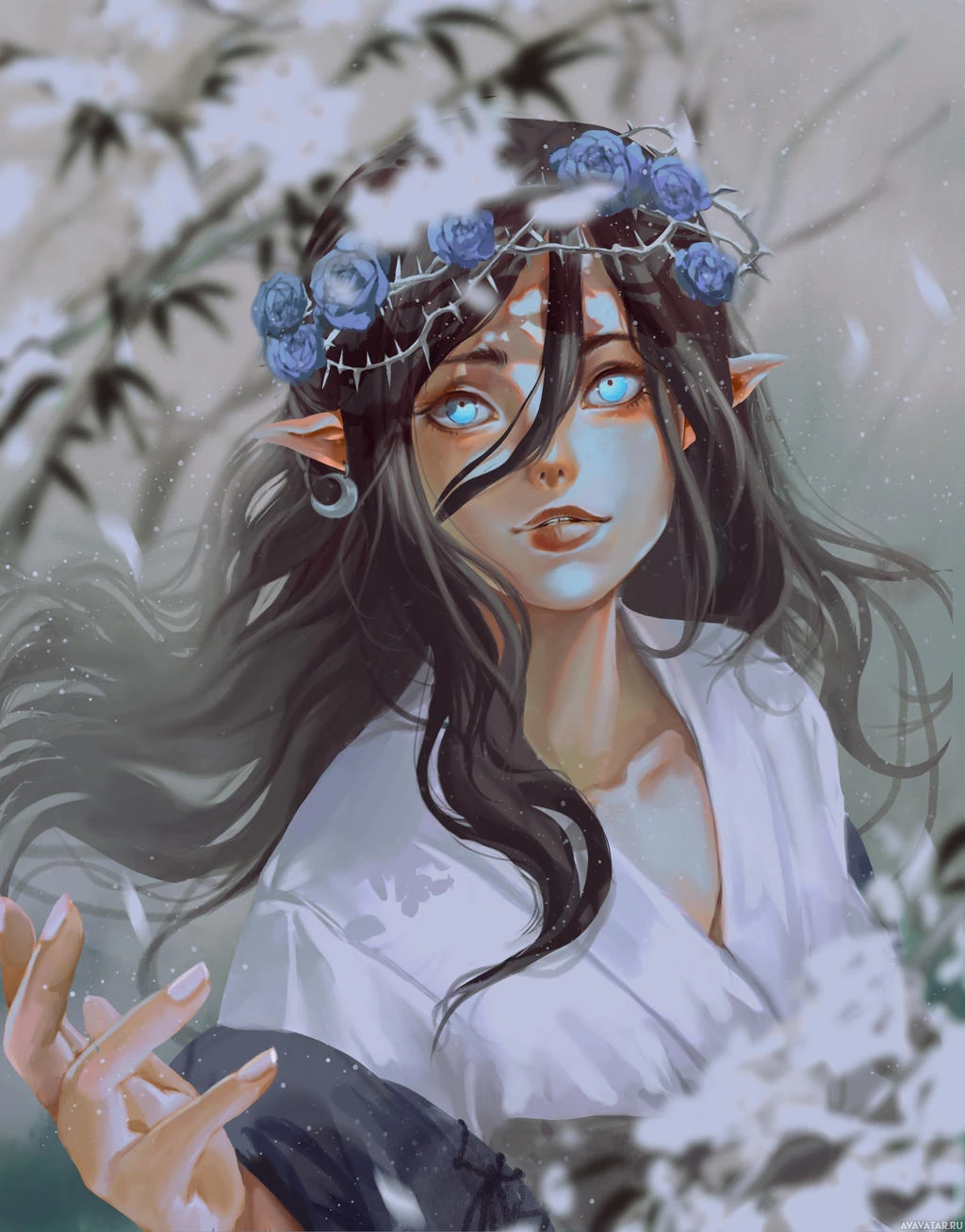 long hair, pointed ears typical of elves in fantasy literature and media, and is adorned with what appears to be a floral crown or wreath on her head, adding to the ethereal and magical atmosphere suggested by the setting. She seems to be standing among snow-covered trees with delicate white flowers scattered around, which creates a serene, wintry
