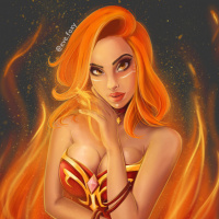 red hair and is adorned in her signature attire, which includes a flame-themed armor and accessories that are often associated with her abilities in the game, such as her staff and a fiery background that suggests she has some form of magical fire control. The art style is reminiscent of comic book illustrations, giving the character a dynamic and engaging appearance.