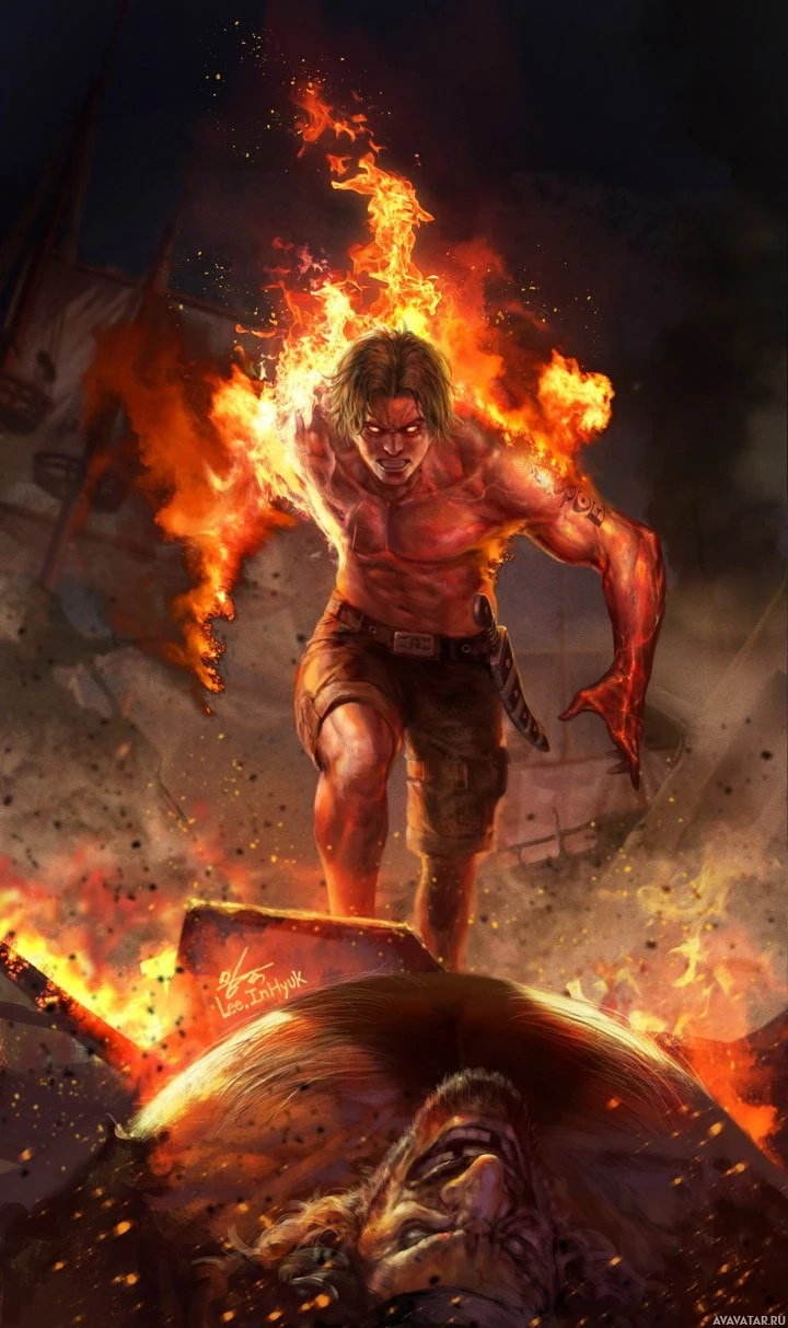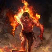 a fantasy setting, who appears to be a man with flames surrounding him. He's holding what looks like a weapon, possibly a bow or slingshot, and seems to be engaged in combat against another figure that is on the ground, suggesting an action-
