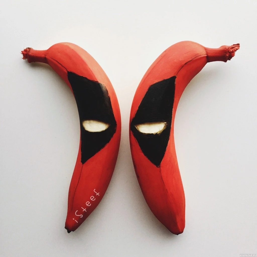 The image shows two bananas positioned to resemble the mask of Deadpool, a fictional