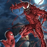 spider webs attached to his wrists and is swinging through the air on what appears to be a web. The other character is Carnage, who is depicted with a red and black suit that resembles Spider-Man's, but with additional fanged mouth appendages and a more menacing appearance. Both characters are set against a backdrop of