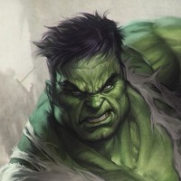 a dynamic pose, flexing his muscles with an intense expression on his face, which reflects his superhuman strength and rage that is characteristic of this iconic figure.