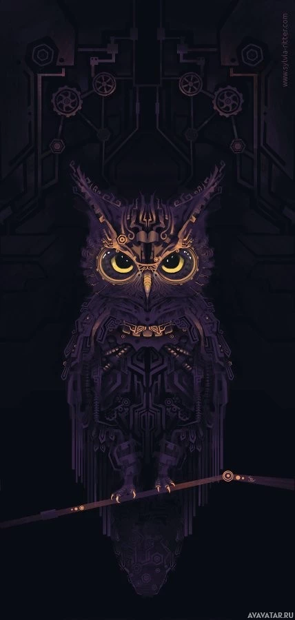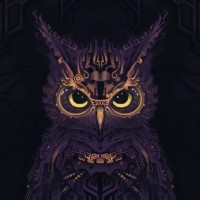 The image shows an owl, which is a type of bird. This particular depiction of the owl appears to be stylized with a futuristic or sci-fi theme. It looks like it could be from a game, movie, or artwork inspired by such themes. The owl is standing in front of what seems to be a technological or cybernetic background, suggesting a high-