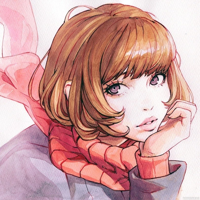 a black coat or sweater underneath. Her expression is one of contemplation or daydreaming as she has her hand on her chin and is gazing off to the side, not directly engaging with the viewer. The artwork is done in an anime or manga style, characterized by its clean lines and