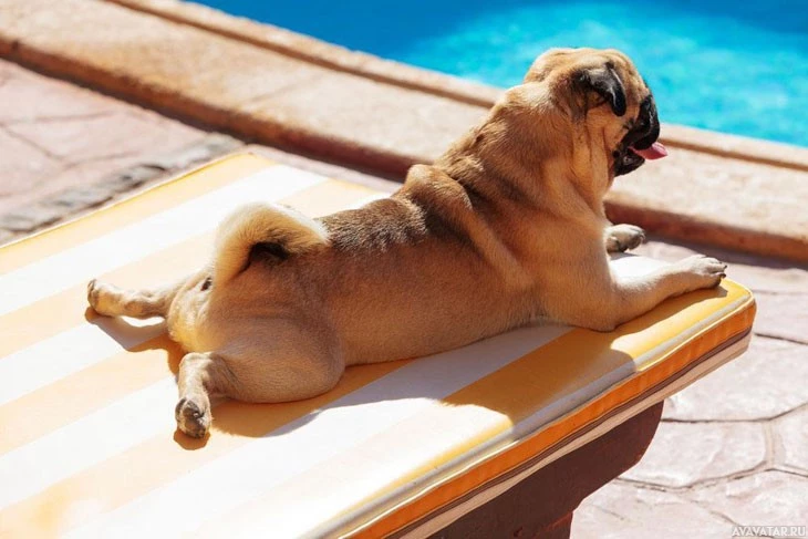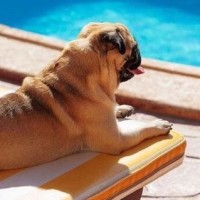 hind legs in the air, appearing relaxed and enjoying the sun. The setting is outdoors, likely near a pool given the presence of a poolside lounging chair or chaise. The environment seems to be warm, possibly during
