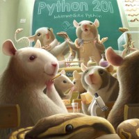 an animated scene where a classroom full of mice is learning about Python, which is a programming language. There's a teacher mouse standing at the front of the room with a chalkboard that has "Python 201" written on it. The students appear to be engaged and interested in the lesson.
