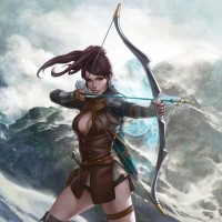 a fantasy character who appears to be an elf. She is holding a bow and seems to be in the process of shooting it, suggesting she might be engaged in archery or hunting. The setting appears to be