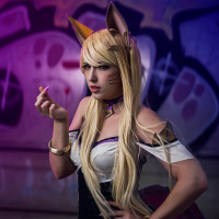 League of Legends." The individual is wearing a costume with elements associated with the character, including a fox-like mask on their face and holding a cigarette between their fingers. The setting appears to be