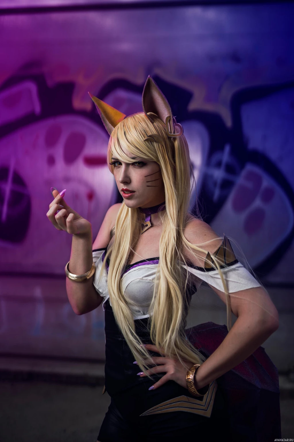 The image shows a person cosplaying as the character Ahri from the game "