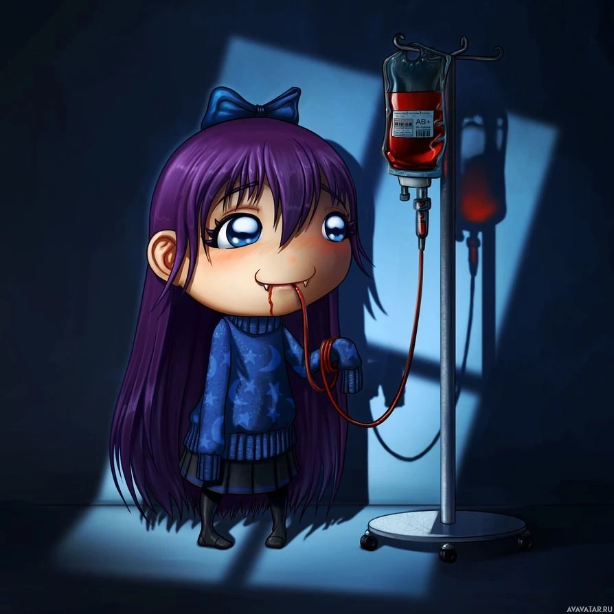 bite mark on her neck and is standing next to a medical blood donation station, which includes a syringe with blood being drawn. The setting seems to be a dark or ominous environment, possibly hinting at the danger associated with