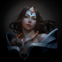dark hair and a distinctive headdress that features a crescent moon motif. This style of artwork often focuses on highlighting the character's design and mystique within the game context.