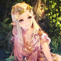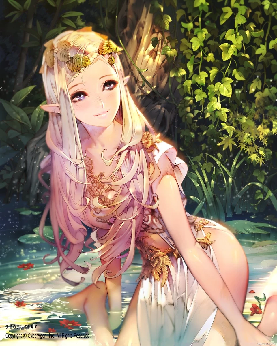 blonde hair and is sitting next to what looks like a small stream of water, surrounded by lush greenery and flowers. She's wearing a dress with intricate details that suggest she might have a connection to nature or