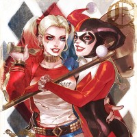 Harley Quinn and Poison Ivy. Both are depicted in their iconic costumes with elements that represent their characters' personalities and themes: Harley Quinn's red, white, and blue color scheme along with her baseball bat, which symbolizes chaos and anarchy, and