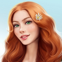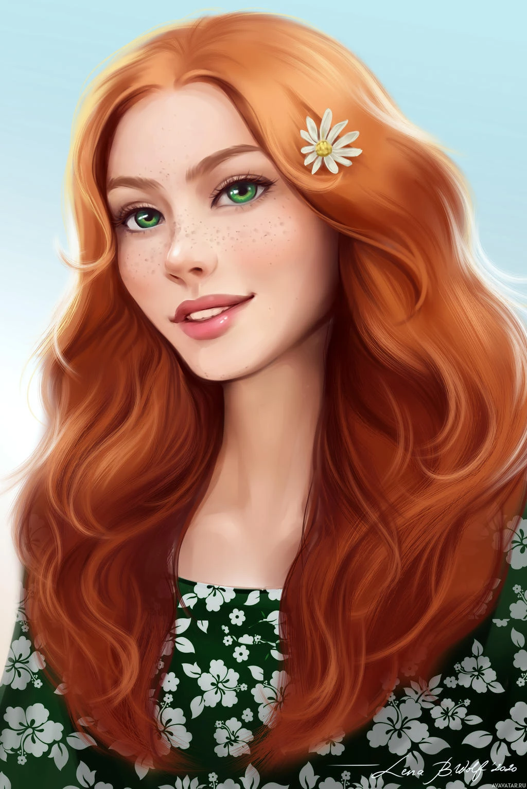 На картинке показана цифровая иллюстрация девушки с рыжими волосами и веснушками. У нее зеленые глаза и она улыбается зрителю. Девушка носит платье с цветочным узором, предполагающее непринужденный или расслабленный стиль.