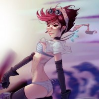 pink hair and is wearing a white top with black gloves. The character is sitting on a motorcycle that appears to be part of some sort of mechanic or