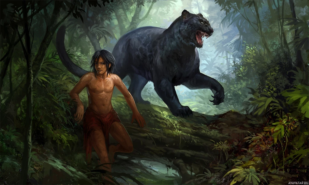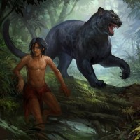 a young man or boy, dressed in loincloth, suggesting he might be Mowgli from the story "The Jungle Book." He is facing away from the camera, looking towards the panther with