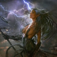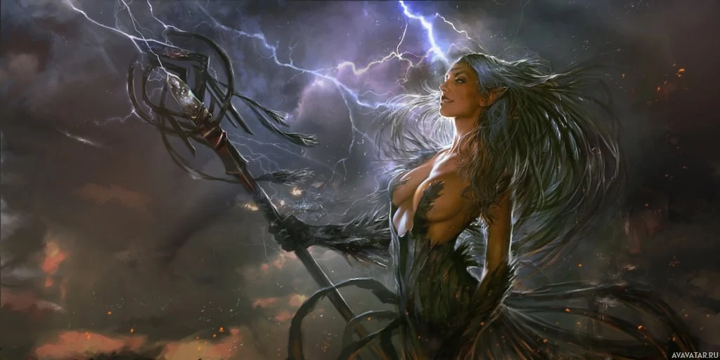 a dramatic sky with dark clouds, lightning bolts striking downward, and an overall chaotic and intense atmosphere. The figure is holding a staff, which could imply