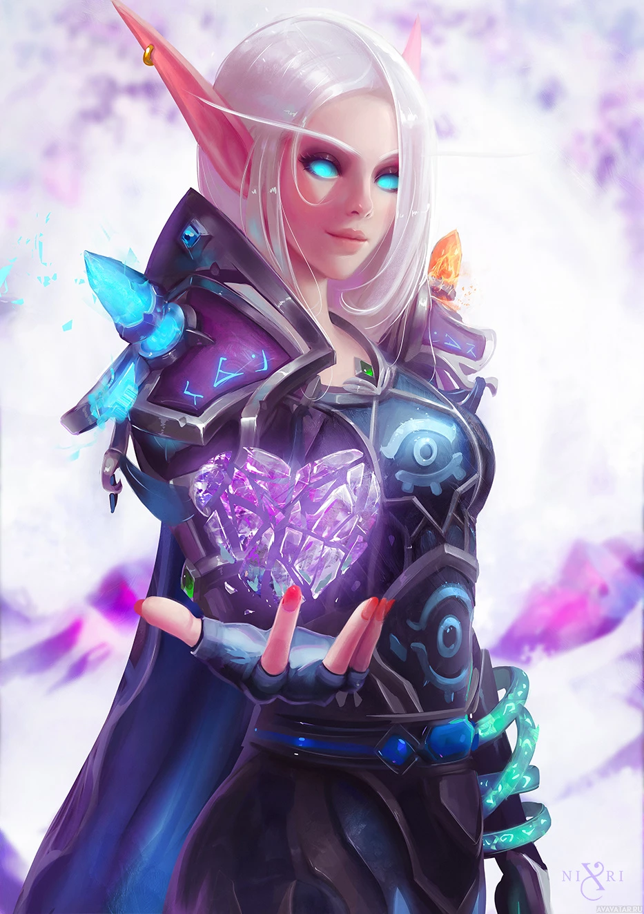 a female character with white hair, who appears to be an elf in a fantasy setting. The character is wearing armor and holding what seems to be a magical artifact or crystal that could be associated with