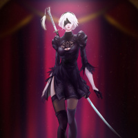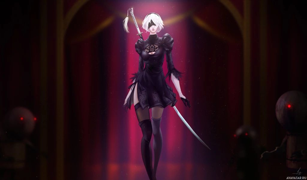 the video game "Nier: Automata." The character is standing in a grand setting, possibly a stage or a performance area, with