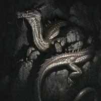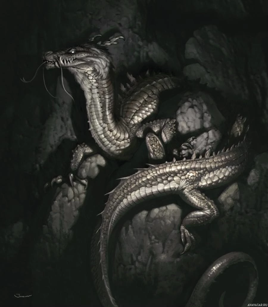 На картинке изображен фантастический дракон. Он имеет чешуйки с текстурированным внешним видом, возможно, напоминающие доспехи или жесткую кожу, и он сидит на скалистой местности, которая выглядит как край скалы или склон горы. Художественные работы детализированы и выглядят в реалистичном стиле, что свидетельствует о высоком уровне мастерства художника.
