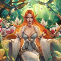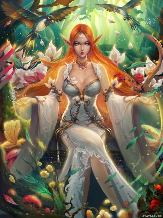 red hair, surrounded by various natural elements such as flowers and plants. She is depicted in